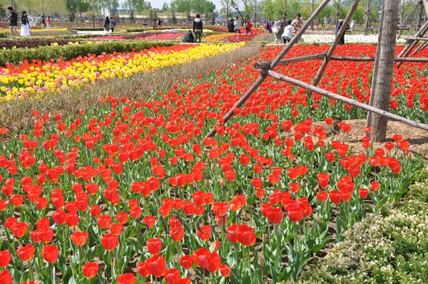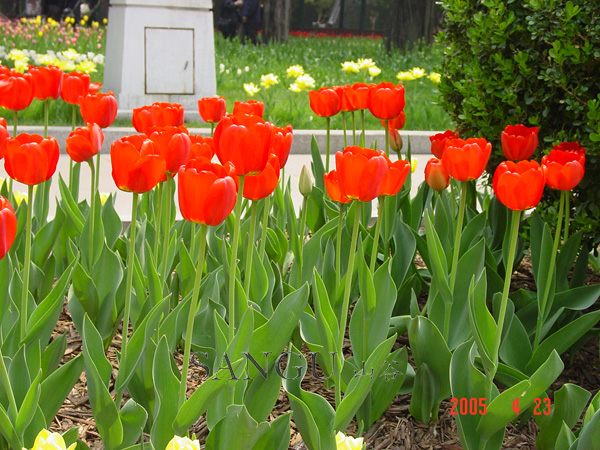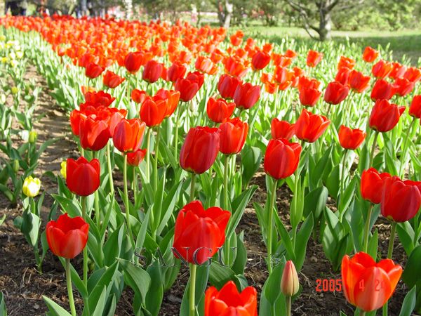 品种评价: 阿波罗郁金香,鲜红色,非常耀眼、醒目,是公园种植的必备品种之一。黑色的花心周围有一圈黄色,在阳光的照耀下就好像花心为黄色一样。